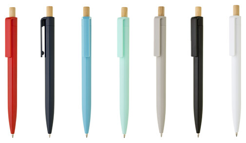 Stylové pero XELIO RABS s barevným plastovým tělem a elegantním bambusovým cvakátkem. Náplň X-20, modře píšící.
