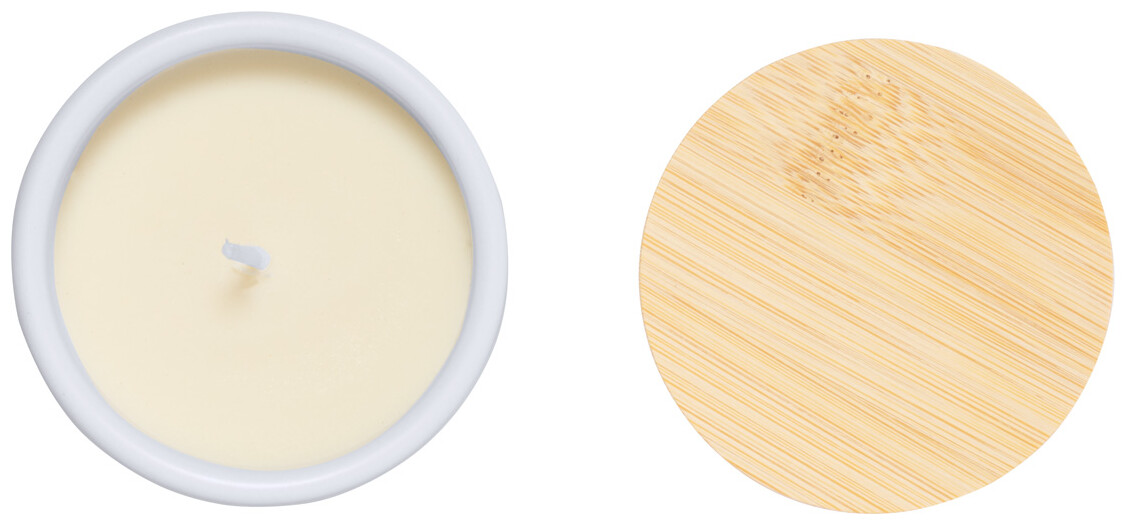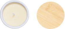 Rostlinná vosková svíčka s vůní vanilky v keramickém stojánku se dnem z přírodního korku a bambusovým víčkem.