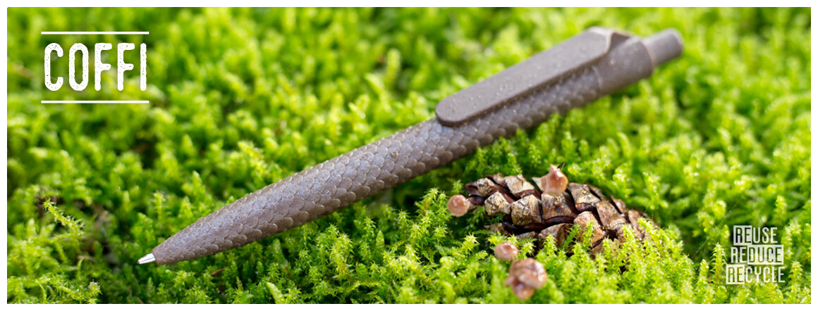 Propiska s 30% podílem kávové sedliny a 70% ABS plastu, v designovém provedení s šupinovým povrchem a velkým klipem určeným na tisk. Kolekce SAVE THE NATURE.