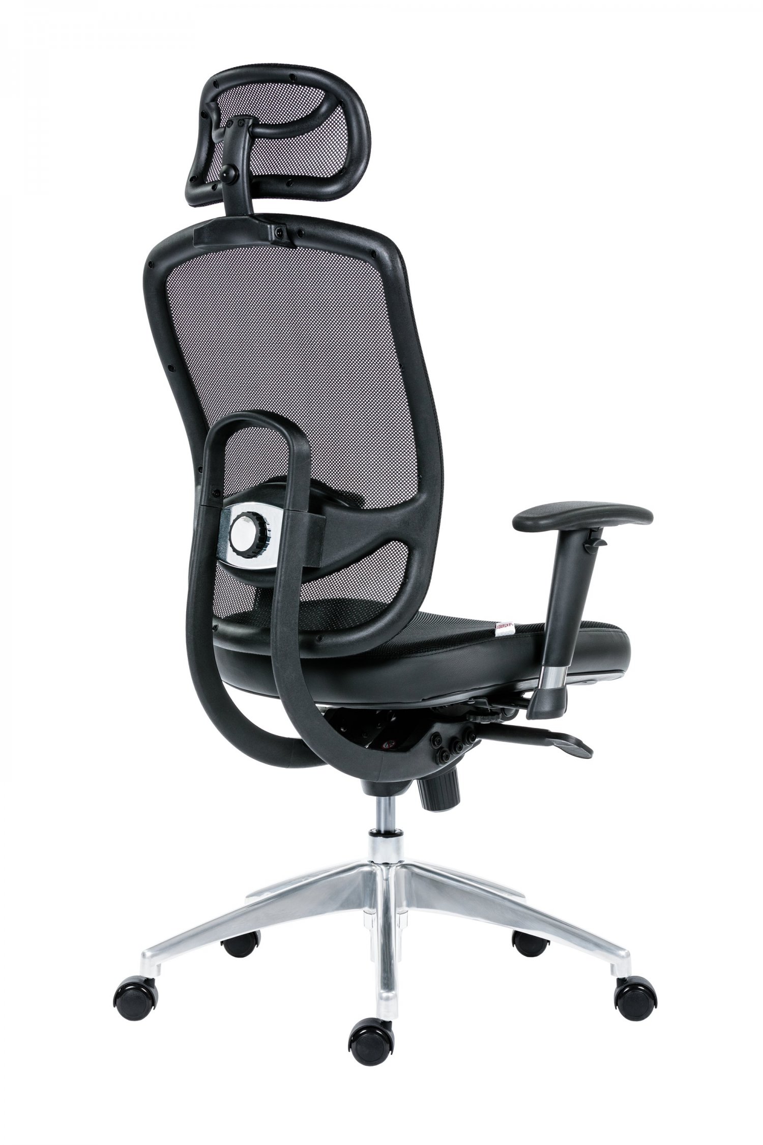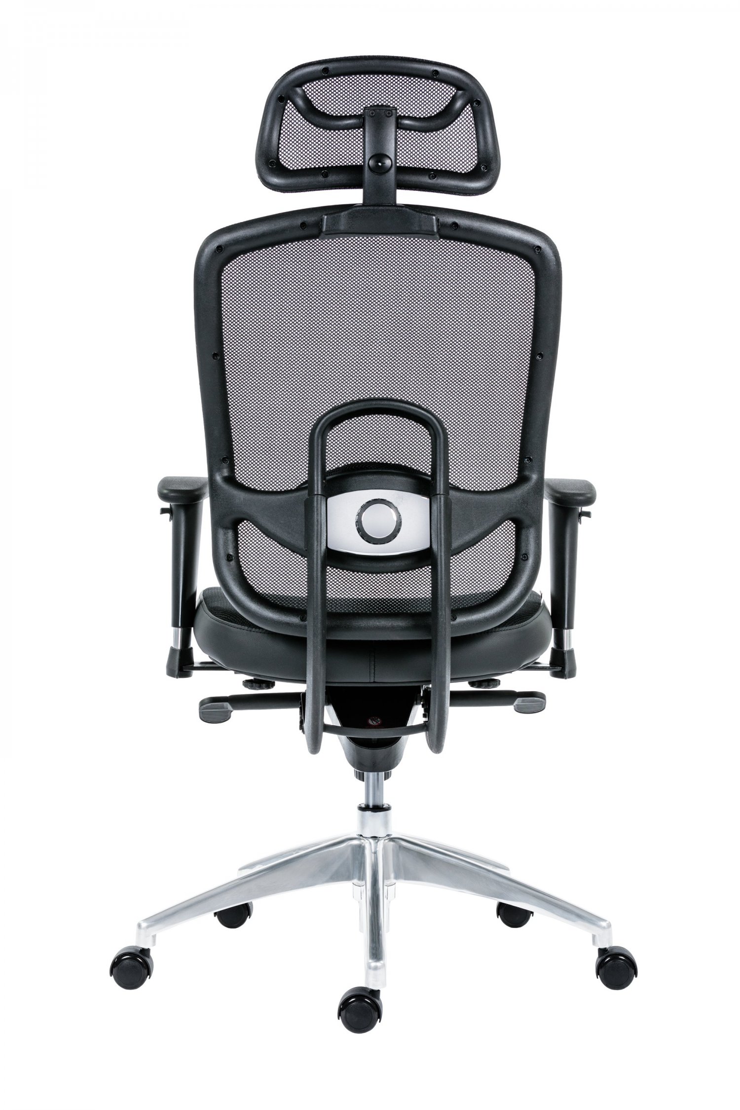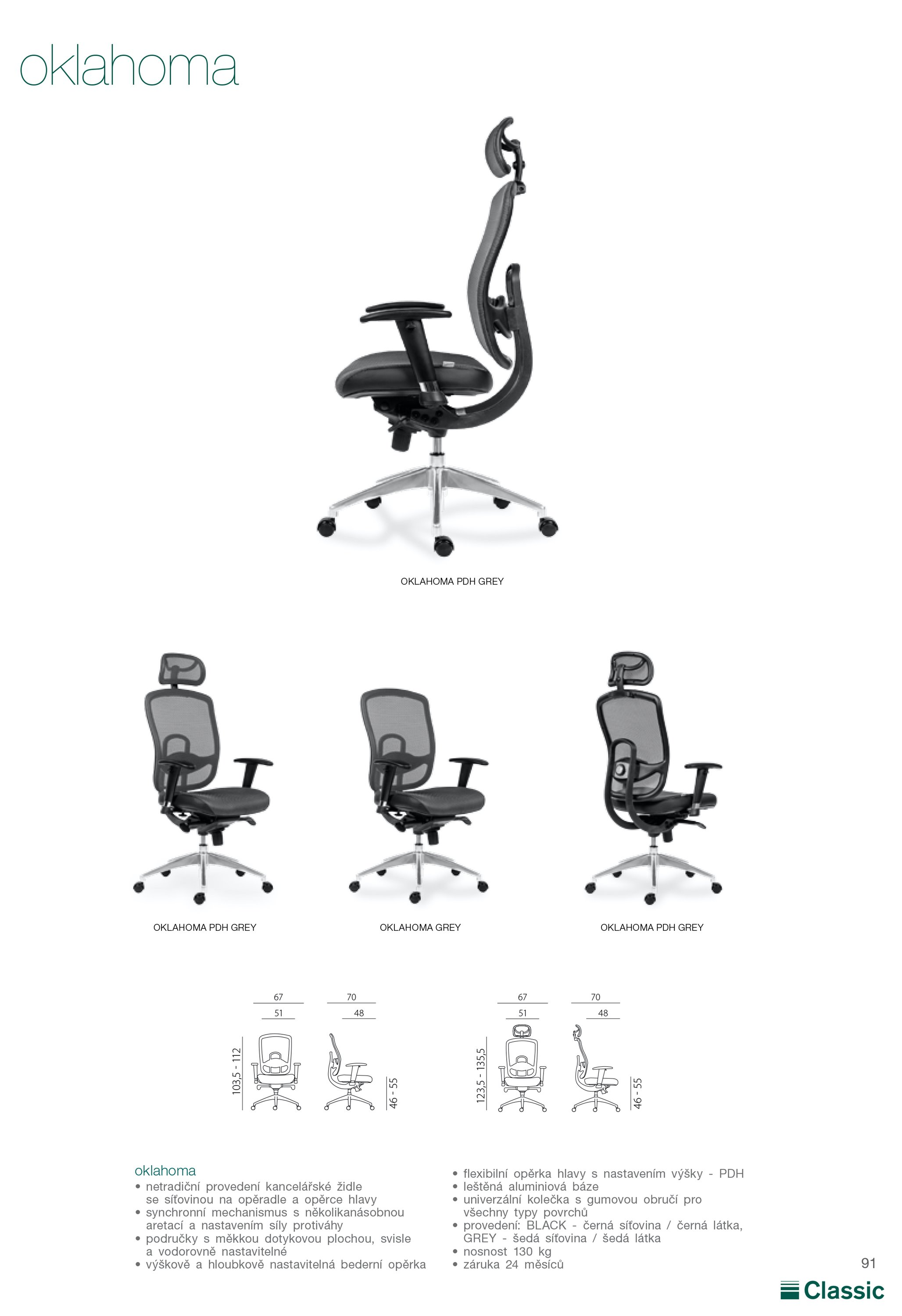 pracovní židle s prodyšným opěrákem a opěrkou hlavy, synchronní mechanismus s nastavením síly protiváhy a několikanásobnou aretací, bederní regulovatelná opěrka, svisle a vodorovně nastavitelné područky s měkkou dotykovou plochou, aluminiová leštěná báze, kolečka s gumovou obručí pro všechny typy povrchů, nosnost 130 kg, záruka 24 měsíců