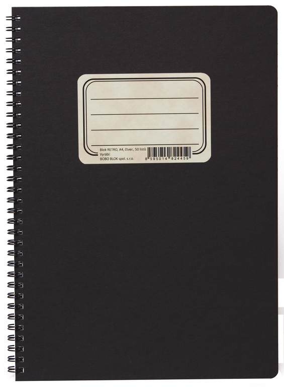 Blok s boční kroužkovou vazbou, tvrdými deskami v RETRO designu, 50 listů. Formát: A4, čtverečkovaný.