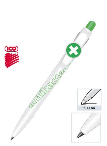 Kuličkové pero se stiskací mechanikou, vyměnitelná náplň X-20, hrot 0,8 mm, materiál těla má antibakteriální účinky.