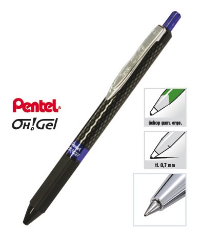 Gelové pero Oh!Gel, stopa 0,7 mm. S rychleschnoucím inkoustem. Moderní design s kovovými doplňky, mačkací mechanika. Speciálně tvarovaný pogumovaný grip pro pohodlné psaní. Barva doplňků odpovídá barvě náplně. Náhradní náplň LR7.