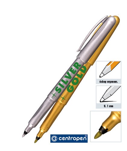 Popisovač se zlatou nebo stříbrnou stopou písma. Ideální pro psaní, kreslení a dekorování na tmavých i světlých papírech. Inkoust je permanentní na papíře a porézních materiálech a částečně permanentní na skle, kovech a plastech. Válcový hrot, šíře stopy cca 1 mm. Skladujte ve vodorovné poloze.