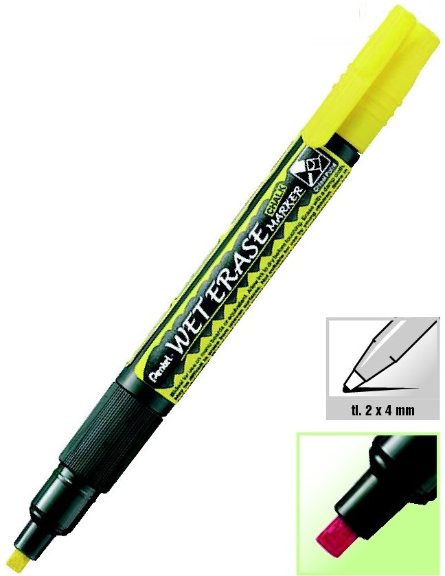 Křídový popisovač. Stopa 2 x 4 mm. Popisovač pro psaní na všech nesavých a hladkých materiálech jako je sklo, plast atp. Ideální na upoutávky, dekorace, sdělení na výlohy prodejen, menu v restauracích, na skla automobilů. Zaschlý popisovač je odolný dešti. Stopa se maže pomocí vlhké látky či houbičky.