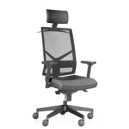 židle s vysokým síťovaným opěrákem a výškově nastavitelnou bederní výztuhou, volitelný podhlavník se sítí nebo čalounem výškově a uhlově nastavitelný, možnost doplnění ramínka na oděv, nastavení výšky opěráku s uzamykáním, čalounění ze studené pěny, nový design sedáku s výrazným zaoblením přední hrany a robustní výškou pro maximální pohodlí synchronní mechanismus s čtyřnásobnou aretací, automatickým nastavením síly protiváhy a nastavením hloubky sedáku, plastová báze, kolečka pr. 60 mm pro měkké podlahy, volitelné područky, nosnost 150 kg, český výrobek, záruka 60 měsíců
