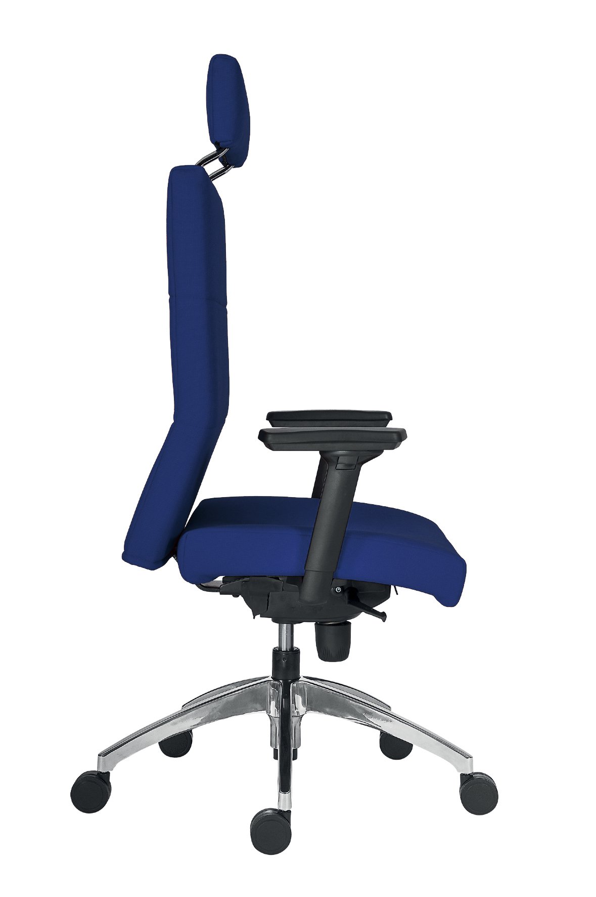 křeslo se středně vysokým opěrákem a podhlavníkem, synchronní mechanismus s čtyřnásobnou aretací, automatickým nastavením síly protiváhy a nastavením hloubky sedáku, moderní kvadratický tvar čalounění respektující současně ergonomická zakřivení, výškově nastavitelné područky se čtyřmi funkčními nastaveními (AR12), kolečka pr. 60 mm pro měkké podlahy, ALU leštěná báze, prošívané čalounění, nosnost 160 kg, český výrobek, záruka 60 měsíců