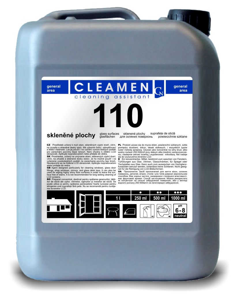 CLEAMEN 110 skleněné plochy 5l je účinný a všestranný prostředek, který dokonale vyčistí a vyleští vaše okna, zrcadla, vitríny a další skleněné plochy. Díky jeho inovované receptuře a ovocné vůni zanechá vaše sklo zářivý lesk bez šmouh a nečistot. Prostředek je snadno použitelný pomocí rozprašovače, rozmýváku a stěrky, nebo při nižším znečištění mikrovláknovou utěrkou. . CLEAMEN je vhodný pro profesionální i domácí použití.