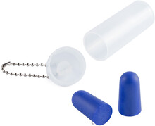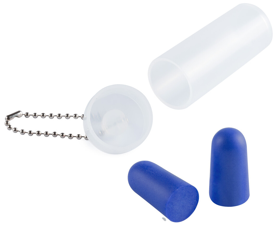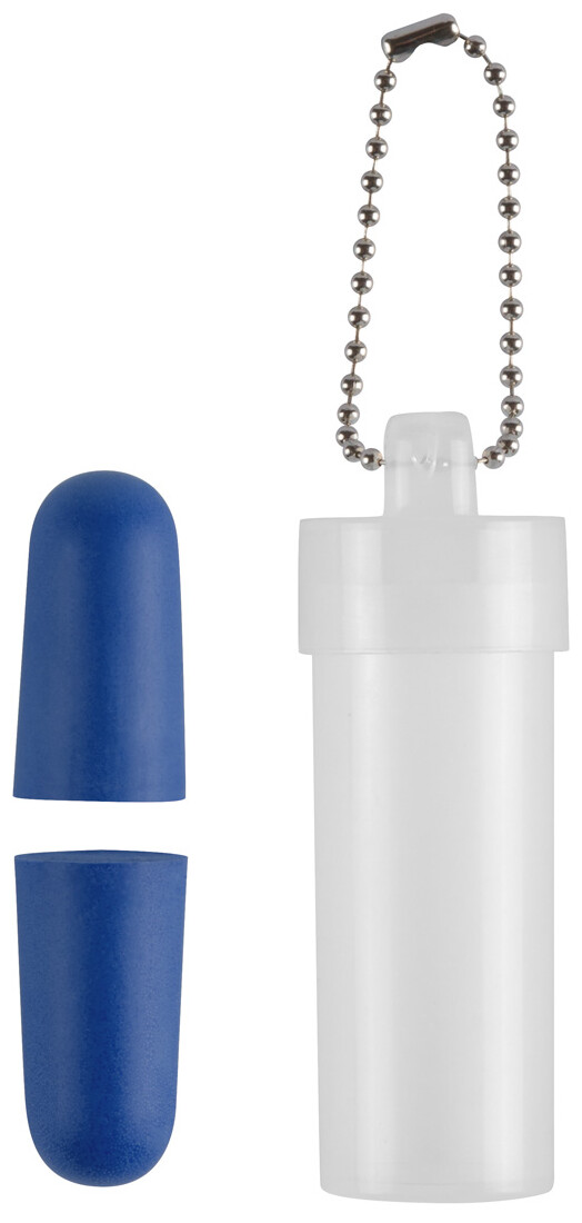 Barevné špunty do uší z EVA materiálu v transparentní plastové krabičce s kovovým řetízkem.