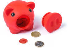 Plastová pokladnička prasátko, s oddělitelným rypáčkem pro otevření.