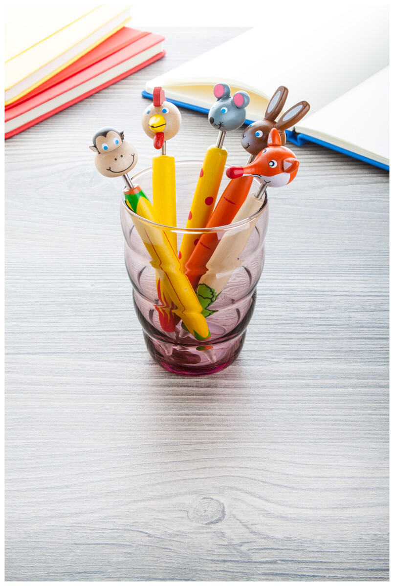 Dřevěné kuličkové pero s barevnou hlavičkou zvířátka, s modrou náplní.