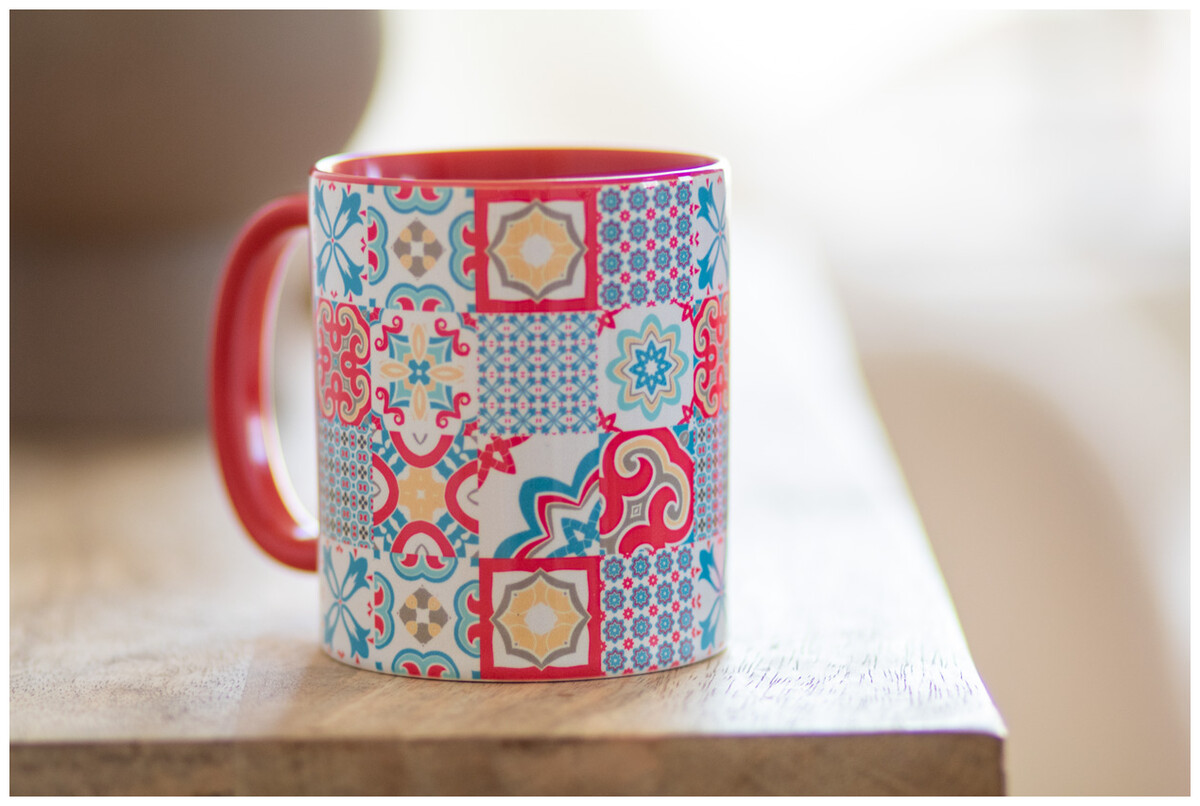 Keramický hrnek s barevným ouškem a vnitřkem, určený na sublimaci, v dárkové krabičce, 350 ml.