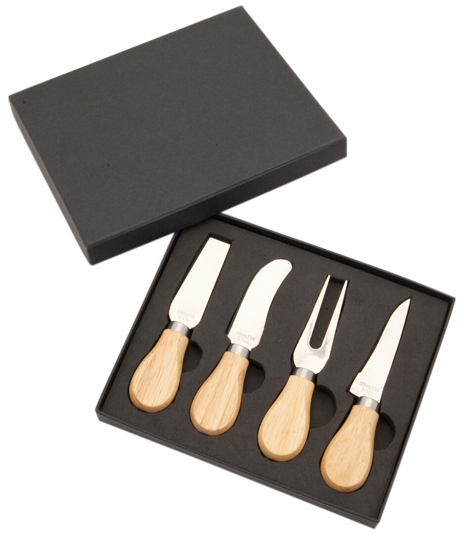4 druhy nožů z nerezové oceli s dřevěnou rukojetí v černé dárkové krabičce.