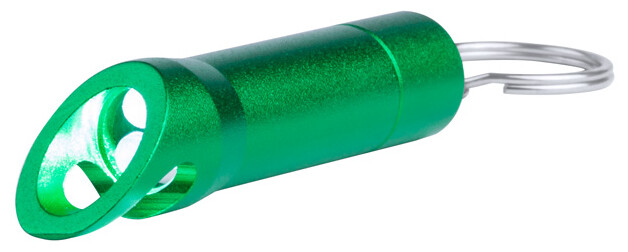 Mini hliníková baterka s 3 LED diodami, otvírákem na láhve a přívěškem na klíče. Dodáváno s knoflíkovou baterií.