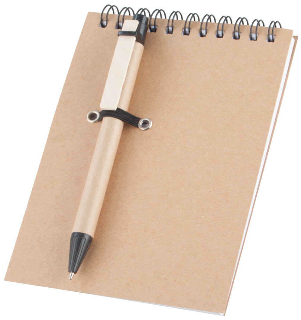 Poznámkový blok se 60 linkovanými listy a s kuličkovým perem, vyrobeno z recyklovaného papíru.