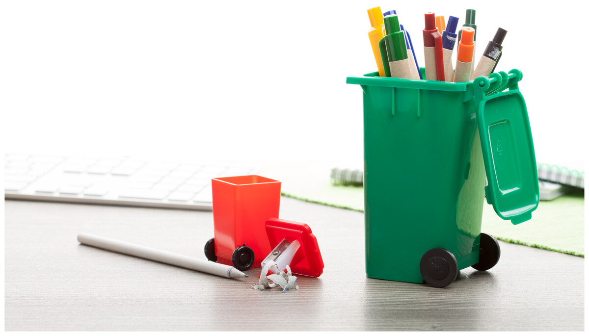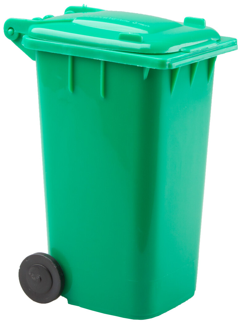 Plastový stojánek na tužky, tvar popelnice.
