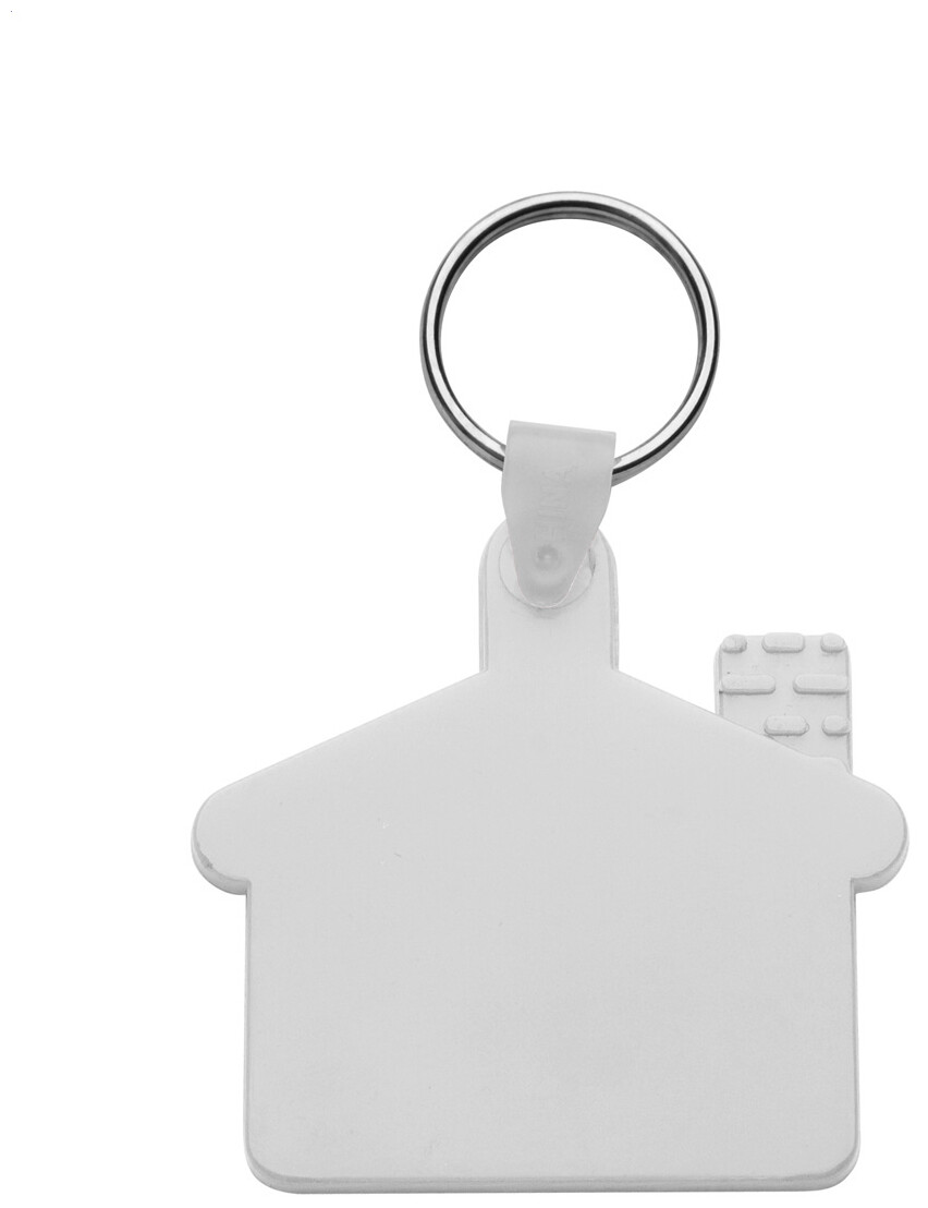 Plastový přívěšek ve tvaru domečku s kovovým kroužkem.