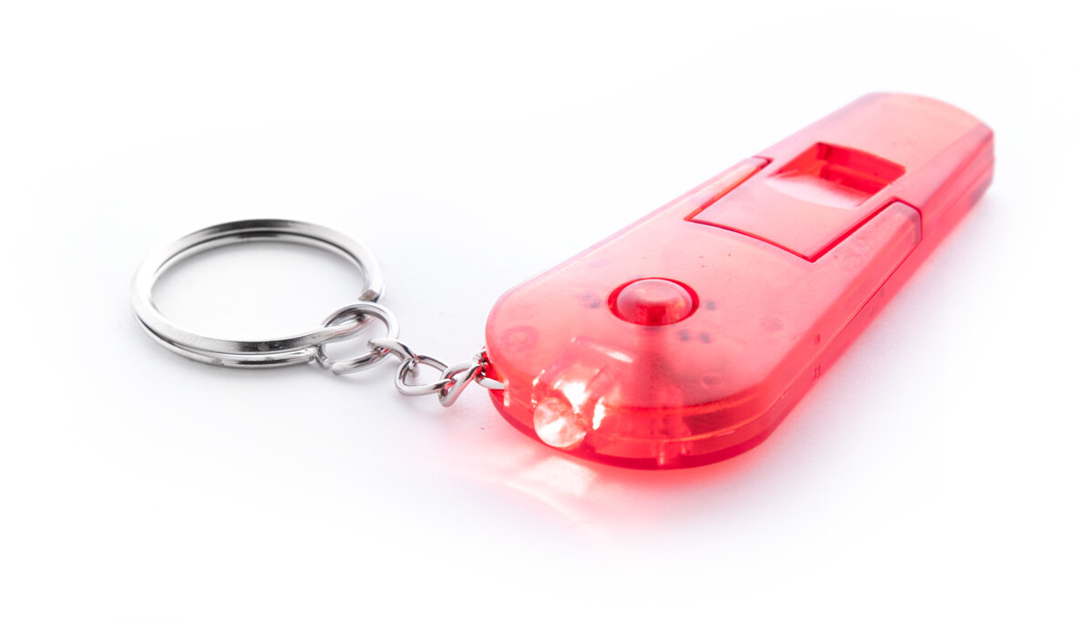 Transparentní plastová píšťalka s kroužkem na klíče se svítilnou, vč. baterií.