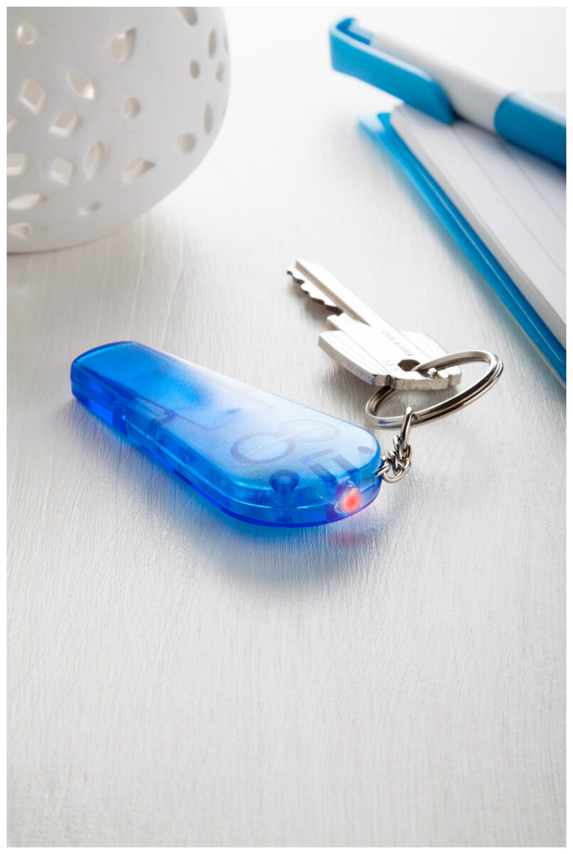 Transparentní plastová píšťalka s kroužkem na klíče se svítilnou, vč. baterií.