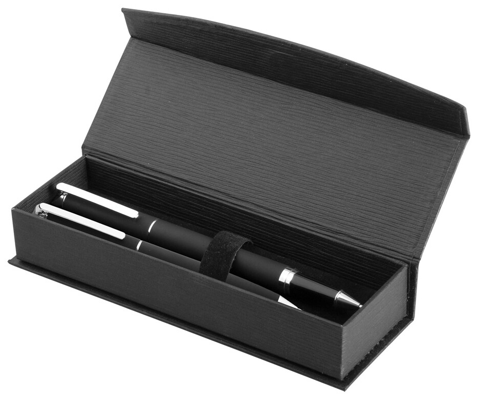 Sada per s černou náplní v dárkové papírové krabičce se zavíráním na magnet. Sada obsahuje keramické pero a kuličkové pero s gumovým povrchem.