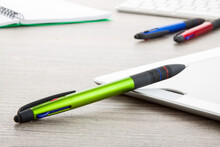 Plastové kuličkové a dotykové pero s pogumovaným úchopem a tělem s matnou metalickou úpravou. Tři barevné náplně: modrá, černá a červená.