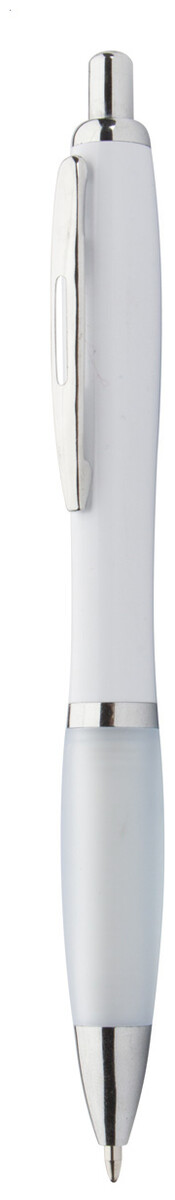 Plastové kuličkové pero s bílým tělem, barevným úchopem a lesklými chromovanými částmi. S modrou náplní.