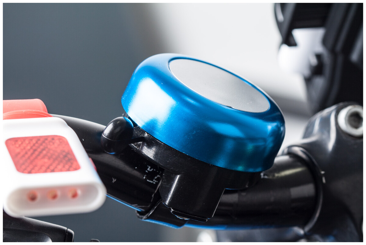Hliníkový zvonek na kolo se stříbrnou plochou.