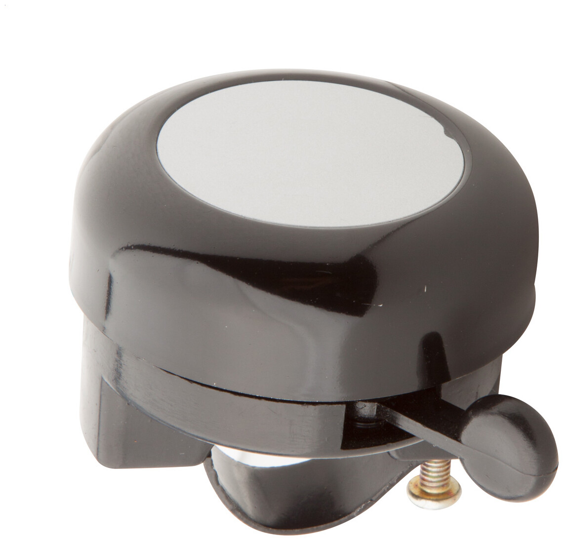 Hliníkový zvonek na kolo se stříbrnou plochou.