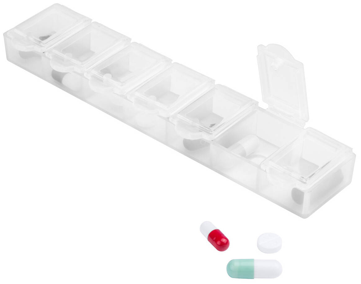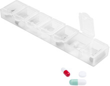 Plastový, týdenní box na pilulky, se 7 přihrádkami.