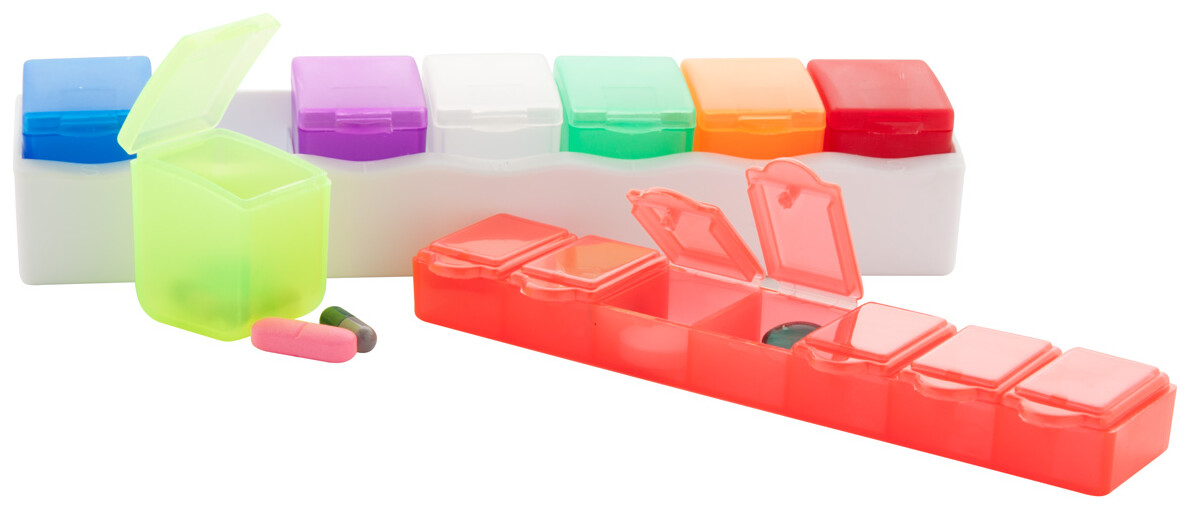 Plastový, týdenní box na pilulky, se 7 přihrádkami.