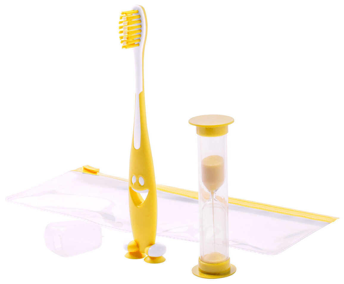 Sada na čištění zubů pro děti s plastovým kartáčkem a přesýpacími hodinami, v obalu na zip.