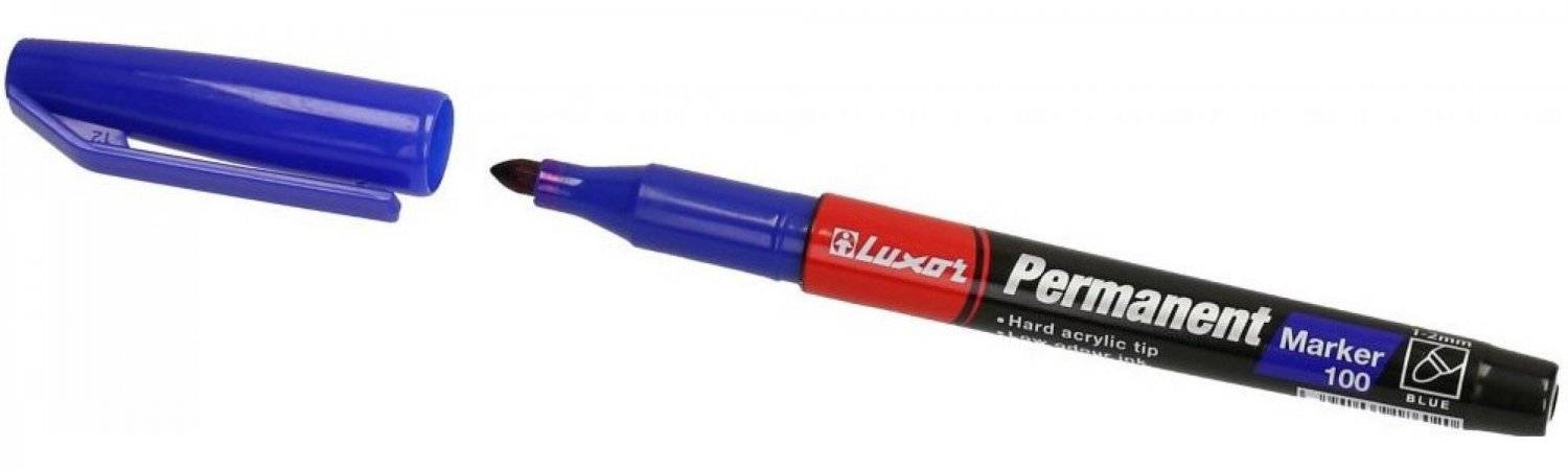 Permanentní popisovač Luxor 100 je vybaven vláknovým kulatým hrotem jehož stopa je 1-2 mm dle tlaku. Fix je vhodný pro popisování dřeva, kovu, skla, a dalších materiálů. Inkoust na alkoholové bázi je modrý, odolný vůči vodě, napsaný text se tak nerozmazává. Neobsahuje xylen ani toluen.