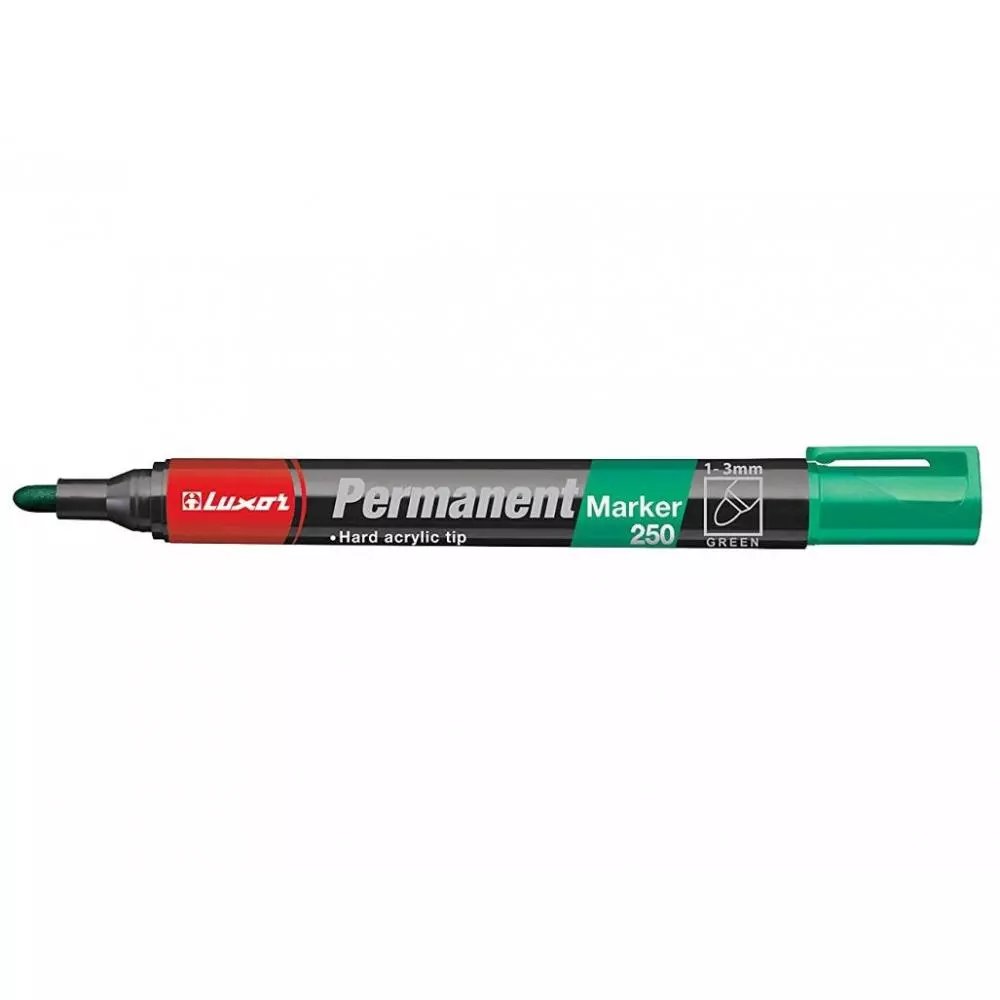 Permanentní popisovač LUXOR 250, je velmi kvalitní, vybaven vláknovým hrotem, kulatého typu, šíře stopy 1-3 mm dle tlaku. Víčko s klipem umožní připnutí fixu na desky nebo papír. Inkoust zelené barvy neobsahuje Toluen ani Xylen a díky tomu nezapáchá, lze tak použít v interiéru i exteriéru na velké množství povrchů např. dřevo, sklo, plast, kov, keramika i kůže.