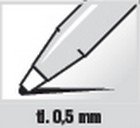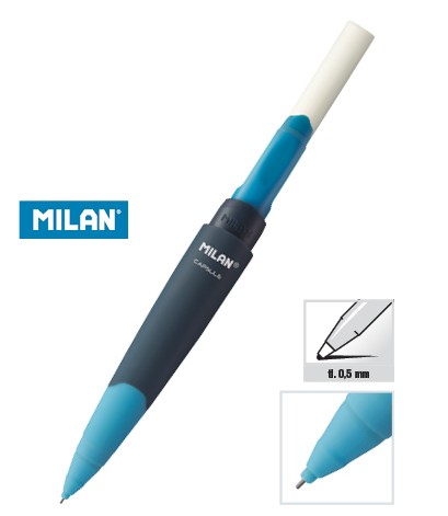 Mikrotužka s pogumovaným tělem umožňuje příjemný úchop. Má velice moderní design, EXTRA velkou pryž MILAN. Dodáváno s tuhou tvrdosti HB, šíře 0,5 mm.  Prodáváno v barevném mixu: modrá, fialová, černá, růžová a zelená.
