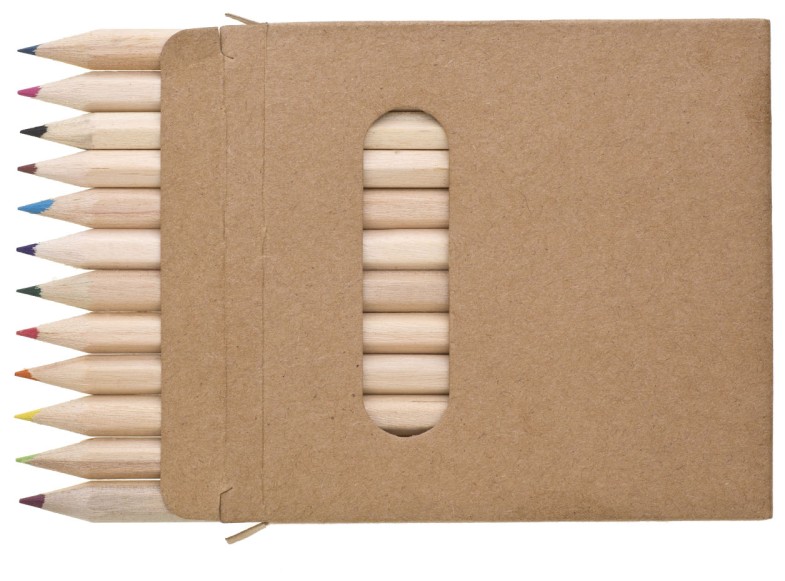 Přírodní, krátké, dřevěné, hrocené pastelky, 12 ks v papírovém obalu. Rozměr obalu 90 x 90 x 8 mm.