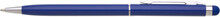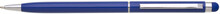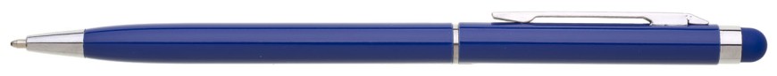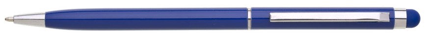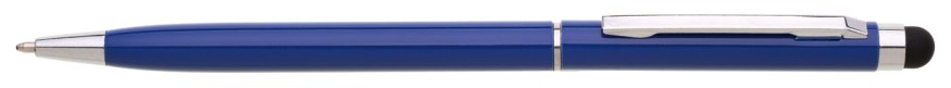 Tenká tmavě modrá kovová propiska s otočným mechanismem a touch koncem. Stříbrné, chromové doplňky, náplně cross, modře píšící. Materiál hliník.