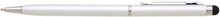 Tenká stříbrná kovová propiska s otočným mechanismem a touch koncem. Stříbrné, chromové doplňky, náplně cross, modře píšící. Materiál hliník.