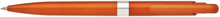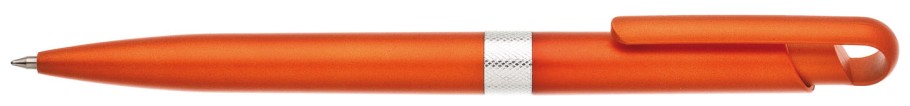 Plastové, kuličkové pero FIROL má oranžové, metalické tělo se stříbrným rýhovaným proužkem uprostřed. Náplň velkoobsahová, modře píšící. Kolekce DESIGN.