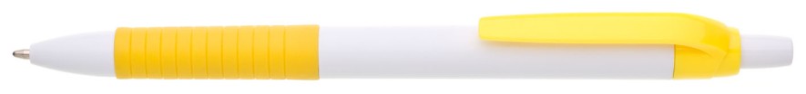Propiska s bílým tělem, žlutým gripem a klipem, náplň modře píšící.