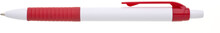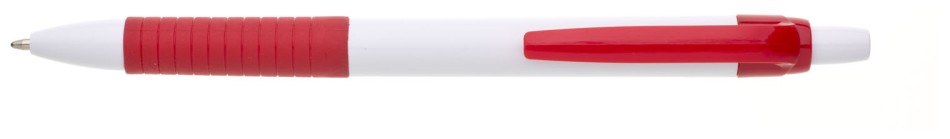 Propiska s bílým tělem, červeným gripem a klipem, náplň modře píšící.