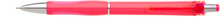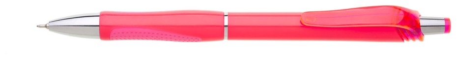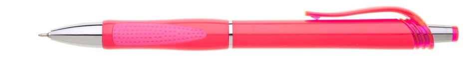 Neonová růžová plastová propiska s transparentním klipem a stříbrnými doplňky. Náplň X20 s mikrohrotem 0,5 mm, semi gel, modře píšící.