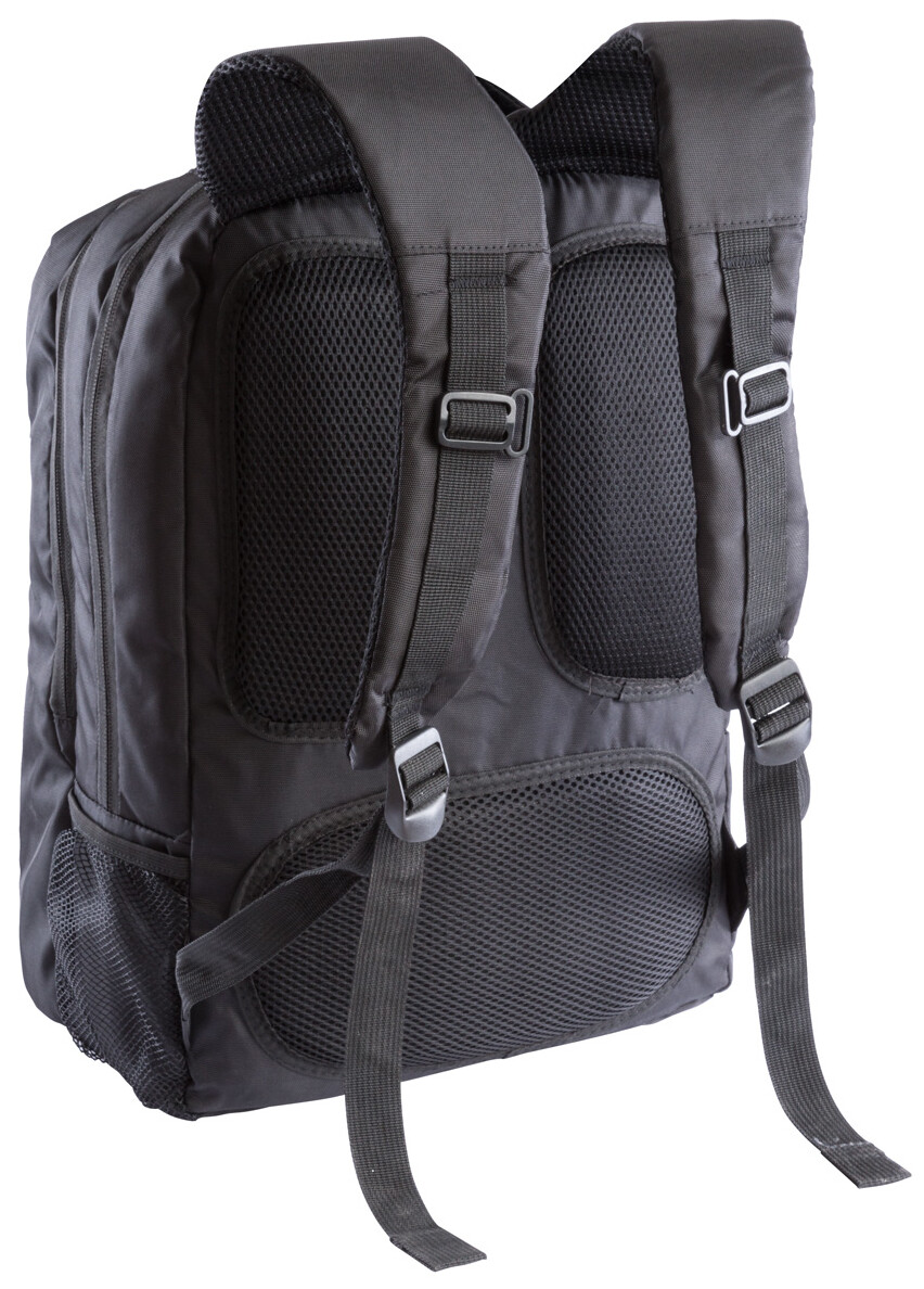 Batoh s mnoha přihrádkami na zip, vypolstrovanou přihrádkou na laptop (15"), vypolstrovanými zády a popruhy, 600D nylon.