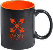 Černý keramický hrnek s barevným vnitřkem, 350 ml. Speciální povrch pro laser, kdy vygravírované logo má stejnou barvu jako vnitřek hrnku. V dárkové krabičce.