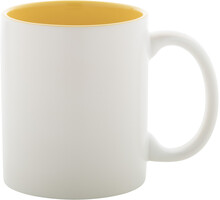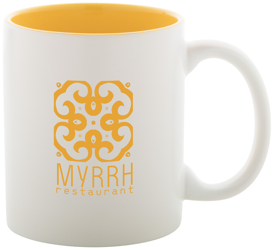 Witte keramiek mok met gekleurde binnenkant, de gegraveerd kleur is hetzelfde als de kleur van de binnenkant. In geschenkverpakking. Inhoud: 350 ml.
