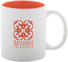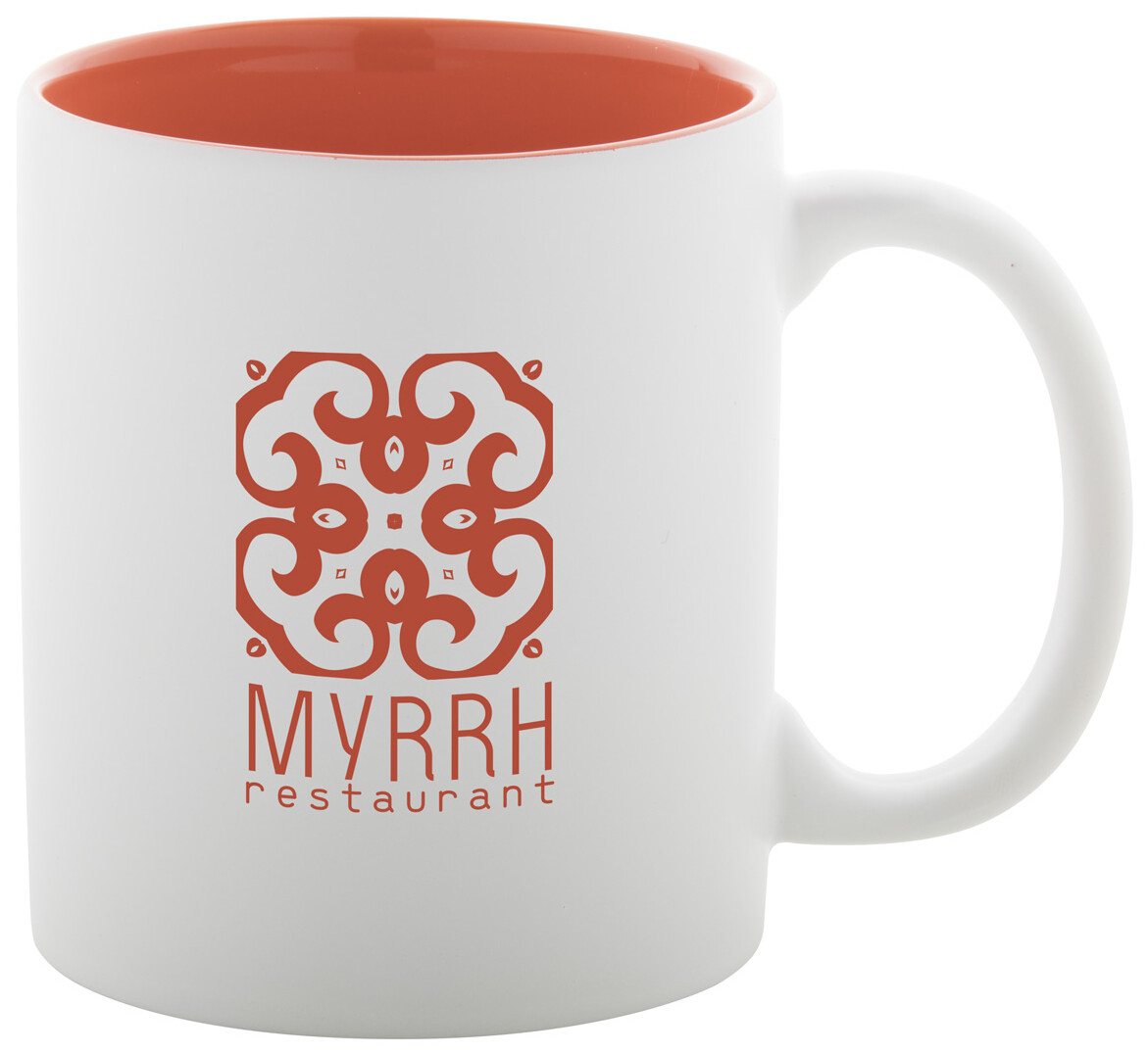 Witte keramiek mok met gekleurde binnenkant, de gegraveerd kleur is hetzelfde als de kleur van de binnenkant. In geschenkverpakking. Inhoud: 350 ml.