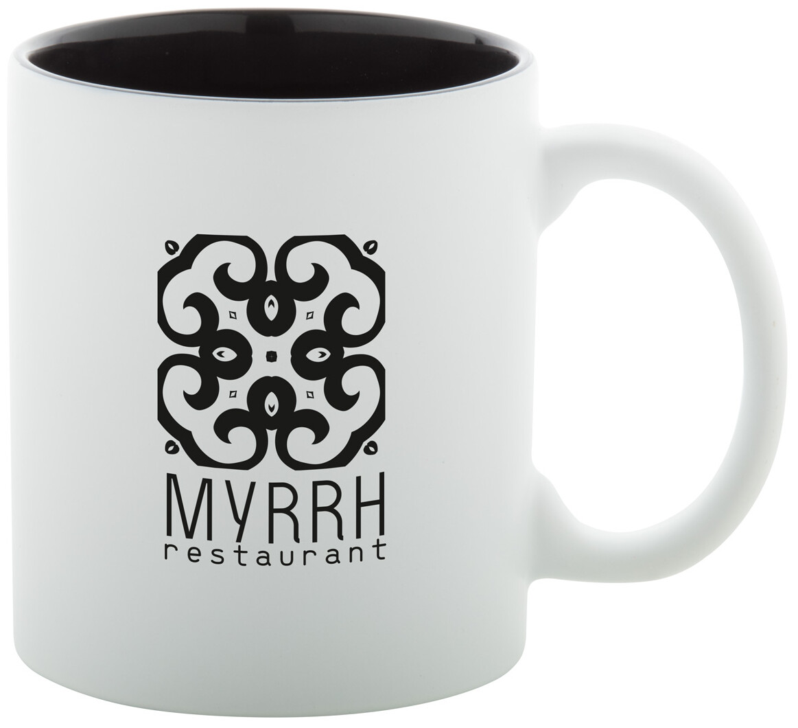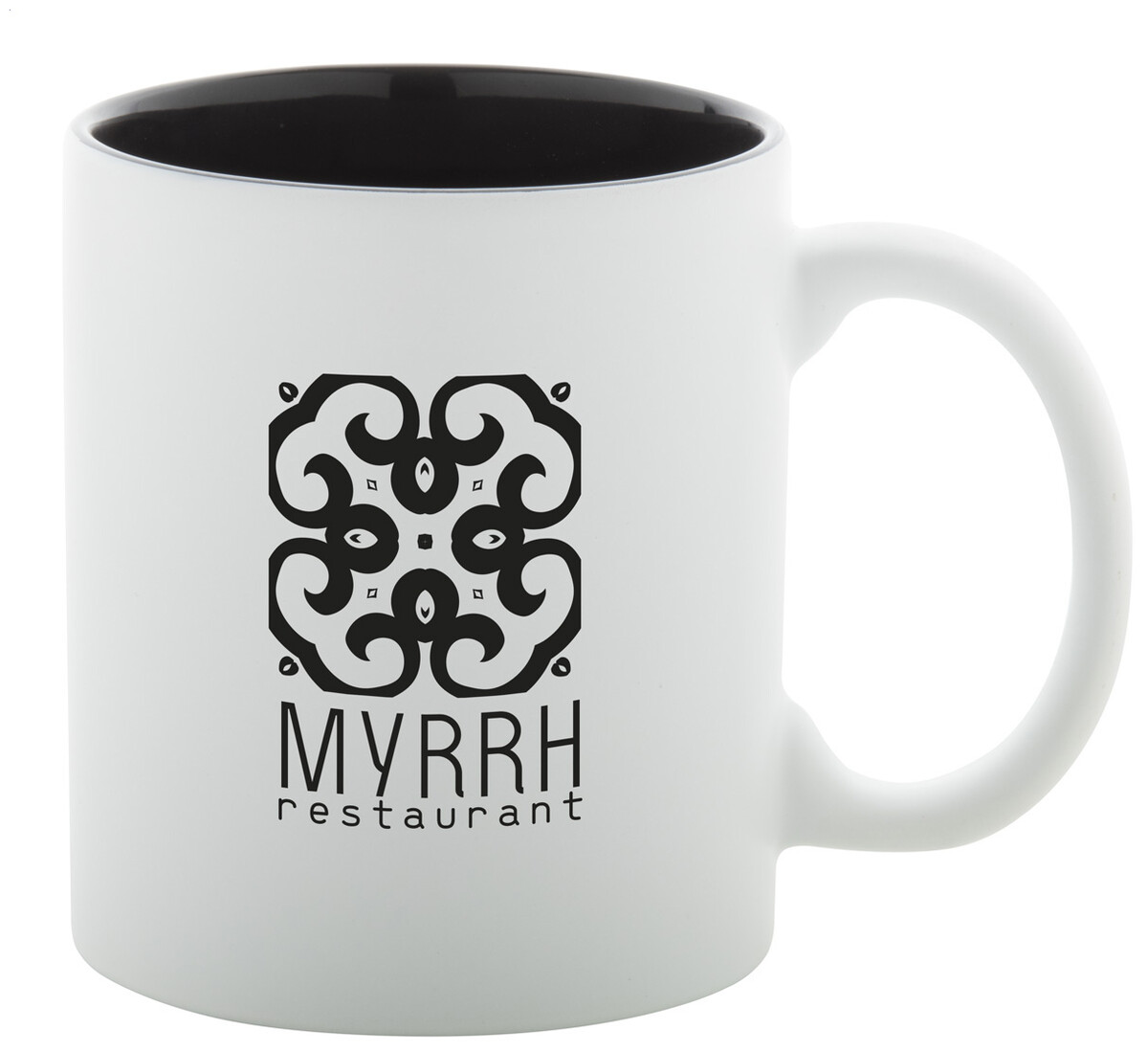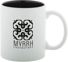 Witte keramiek mok met gekleurde binnenkant, de gegraveerd kleur is hetzelfde als de kleur van de binnenkant. In geschenkverpakking. Inhoud: 350 ml.