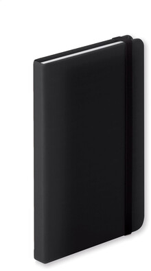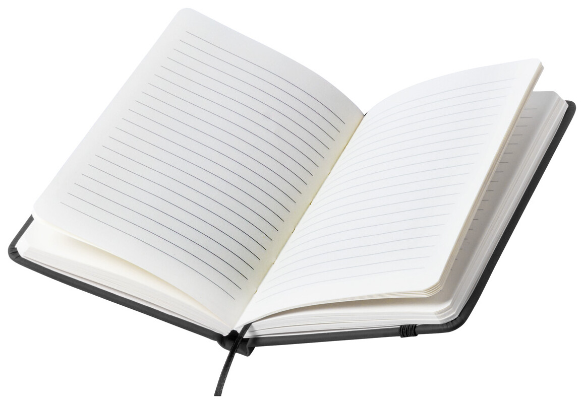 Blok s deskami z PU kůže, se 100 linkovanými listy, záložkou a gumičkou. Velikost A6.