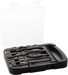 22dílná sada nářadí v plastovém pouzdře. Obsahuje 2ks šroubováků, 1ks kombinovaných kleští, 1 ks držáku, 2 ks dlátek, 5 ks hlavic, 10 ks bitů.