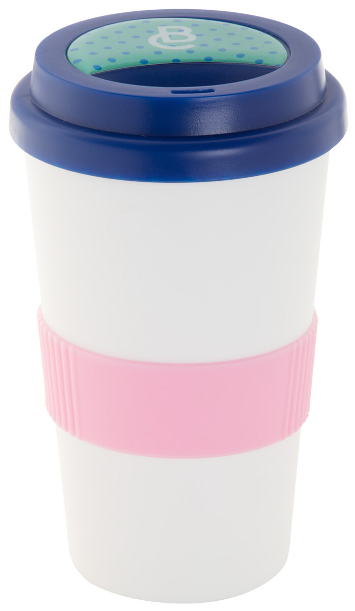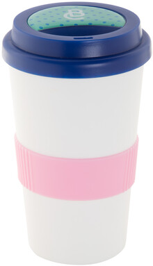 Dvoustěnný plastový termo hrnek s víčkem na pití a silikonovým úchopem na zakázku. 400 ml. Min. mn.: 50 ks.