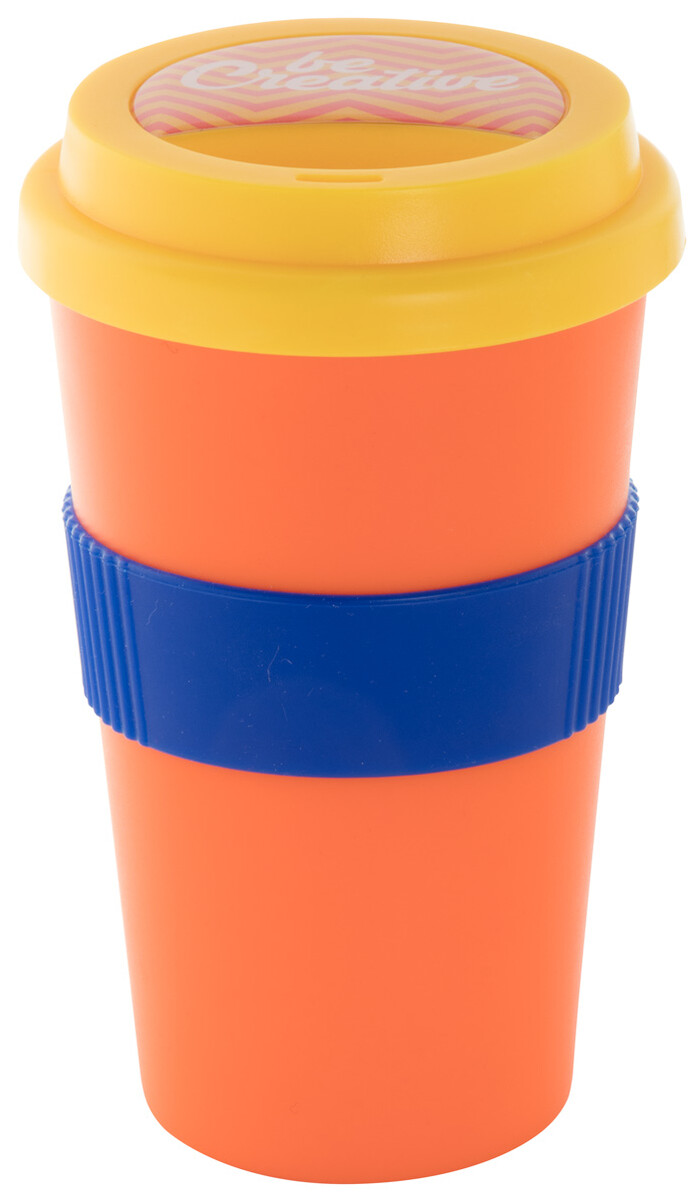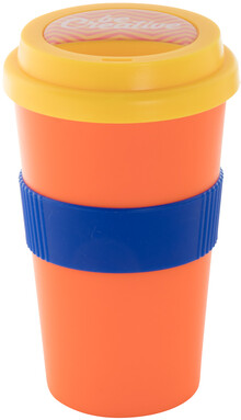 Dvoustěnný plastový termo hrnek s víčkem na pití a silikonovým úchopem na zakázku. 400 ml. Min. mn.: 50 ks.